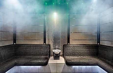 Schloss Lebenberg's spa area features a panoramic indoor pool, a sauna, a steam bath, a sun bed, a gym, and a Finnish outdoor sauna with a unique view.