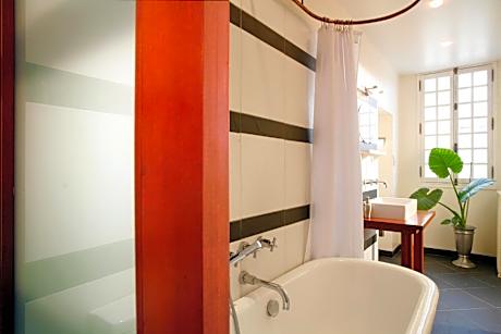 A good location for a stress-free holiday in Saintes, La Porte Rouge - The Red Door Inn is a bed and breakfast surrounded by views of the city. The property features free bikes, garden, and private parking among other facilities. The property is around 24 miles from Royan Train Station, 25 miles from Notre Dame Church, and 25 miles from Congress Center. The accommodation offers free Wifi throughout the property, as well as a terrace and a family-friendly restaurant. At the bed and breakfast, the units come with a desk. There's a private bathroom with shower in every unit, along with bathrobes, a hair dryer, and free toiletries. At the bed and breakfast, units are equipped with bed linen and towels. There is a coffee shop and bar. Guests at the bed and breakfast will be able to enjoy activities in and around Saintes, like cycling. A baby safety gate is also available for guests at La Porte Rouge - The Red Door Inn. Popular points of interest near the accommodation include Saintes Train Station, Saint Pierre Cathedral, and Abbaye aux Dames. La Rochelle - Île de Ré Airport is 48 miles from the property.