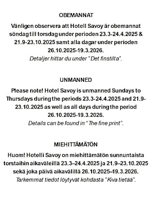 1/50 2/50 3/50 4/50 5/50 6/50 7/50 8/50 9/50 10/50 11/50 12/50 13/50 14/50 15/50 16/50 17/50 18/50 19/50 20/50 21/50 22/50 23/50 24/50 25/50 26/50 27/50 28/50 29/50 30/50 31/50 32/50 33/50 34/50 35/50 36/50 37/50 38/50 39/50 40/50 41/50 42/50 43/50 44/50 45/50 46/50 47/50 48/50 49/50 50/50 查看全部 返回 上一页 下一页 该产品的供应商或所有者应对上述图像的准确性负责。Viaggio 对任何不准确的内容概不负责。 Hotel Savoy Nygatan 12, 22100 Mariehamn, Maarianhamina 22100 View map 酒店说明 Located in Mariehamn, a 14-minute walk from Mariebad Beach, Hotel Savoy has accommodations with a shared lounge, free private parking and a bar. Each room at the 3-star hotel has city views and free WiFi. The hotel provides an indoor pool, sauna and room service. All rooms at the hotel come with a seating area, a flat-screen TV with satellite channels and a private bathroom with free toiletries and a shower. The rooms will provide guests with a closet and an electric tea pot. Buffet and continental breakfast options are available at Hotel Savoy. Popular points of interest near the accommodation include S:t Görans Church, Cultural History Museum of Åland and Åland Maritime Museum. Mariehamn Airport is 2.5 miles from the property.. ((* Sorry, this information is not available in the selected language and is shown in EN) 酒店服务 Room Service Daily Housekeeping Hot Tub or Spa Fire Extinguishers Facilities For Disabled Guests Available Shared Lounge/TV Area Swimming Pool - Indoor Luggage Storage & Lockers Swimming Pool Internet Access - Free Public Access Elevator Parking - Free Smoke Alarms Laundry Non-Smoking Rooms Available Parking - On-Site Non-Smoking Facility Family Rooms Pet Friendly Lounge/Bar 信息 全屏 关闭全屏