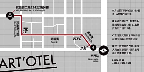 Art'otel provides flawless service and all the necessary facilities for visitors. Maintain seamless communication using the complimentary Wi-Fi at hotel. Effortlessly arrange transportation to and from the airport using the hotel's airport transfer services.Discovering Taipei becomes even more accessible through the taxi, car hire and shuttle amenities provided at the hotel.During your stay at this fantastic hotel, the attentive front desk personnel can provide you with a range of amenities such as concierge service, express check-in or check-out, luggage storage and safety deposit boxes.In search of city's top entertainment, seek assistance at the hotel's ticket service and tours for reservations. At the hotel, utilize the on-site laundromat, dry cleaning service and laundry service to maintain your beloved travel attire fresh, allowing you to bring fewer clothes. Craving relaxation? Make the most of your stay at the Art'otel with convenient amenities like room service and daily housekeeping at your disposal.Kindly note that smoking is prohibited in the hotel to ensure fresher air for all visitors. At Art'otel, every guestroom is provided with convenient amenities and fittings to ensure a comfortable stay.Enhance your experience at hotel with the knowledge that certain rooms are equipped with linen service, blackout curtains and air conditioning for your convenience. Certain rooms offer in-room amusement features such as the cable TV for your enjoyment. In select rooms within the hotel, a refrigerator, bottled water and a coffee or tea maker is available to cater to your requirements when desired.In the hotel, certain guest bathrooms come equipped with essential bathroom amenities, such as a hair dryer, toiletries and towels, ensuring a comfortable stay for guests. At the hotel, discerning guests can also enjoy on-site culinary facilities like shared kitchen tailored to their preferences. At Art'otel, guests can take pleasure in the delightful recreational amenities provided for their entertainment.Discover the fitness amenities at hotel to maintain your health and strength during your getaway. License Number(s): 508. ((* Sorry, this information is not available in the selected language and is shown in EN)